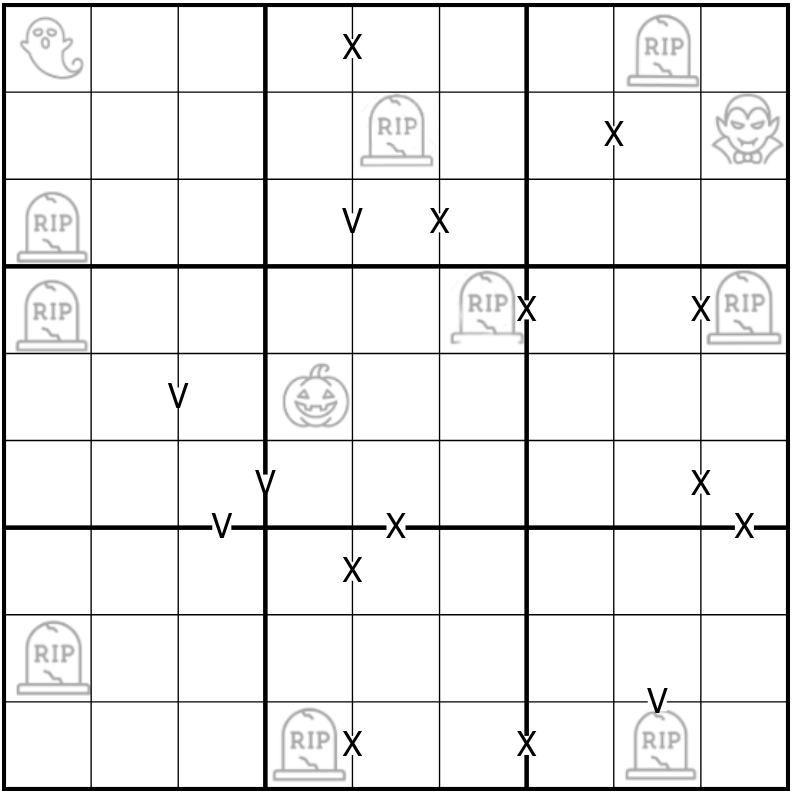 Draw a path through the cemetery from the ghost to the pumpkin that moves only orthogonally and doesn't touch itself, even diagonally. Burial plots (non-overlapping 1x4 ‘I’ tetrominoes) are placed around the cemetery. Each burial plot has a headstone at one end. The path may not enter any cell that is part of a burial plot.