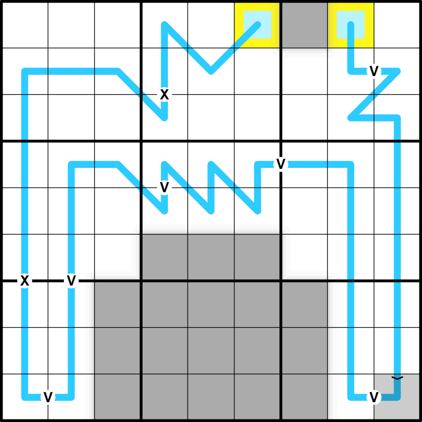 X/V: Digits in cells joined by an X sum to 10. Not all Xs are given. Digits in cells joined by a V sum to 5. All Vs are given.