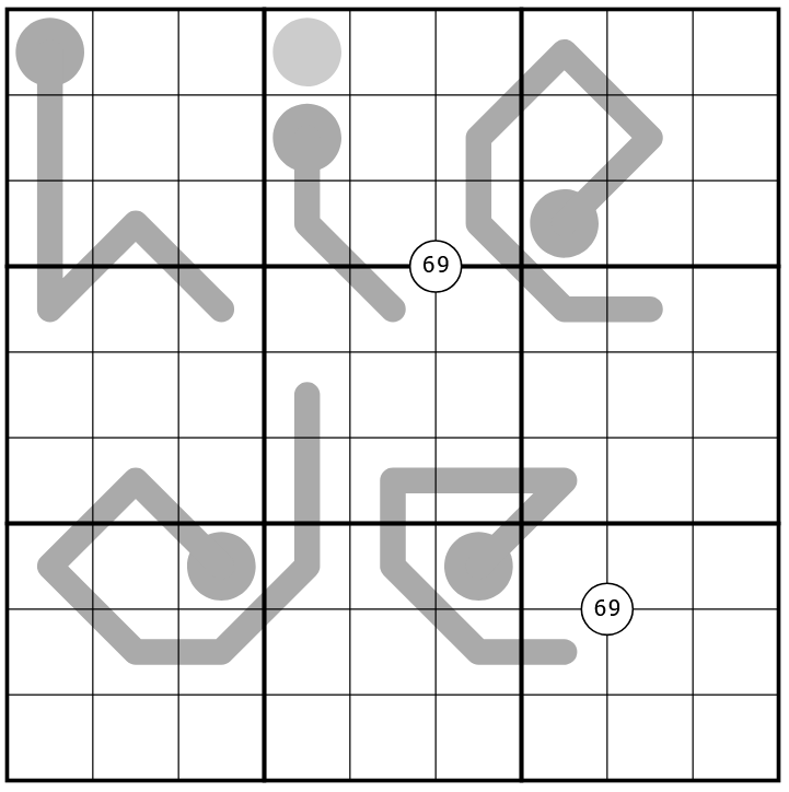 Quadrupel: Die Zahlen innerhalb der Kreise erscheinen mindestens einmal in den vier angrenzenden Zellen.