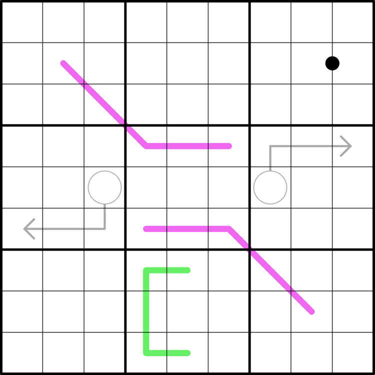- Renban-Linien: Die Ziffern entlang jeder magentafarbenen Renban-Linie müssen aufeinanderfolgende Ziffern in beliebiger Reihenfolge sein.