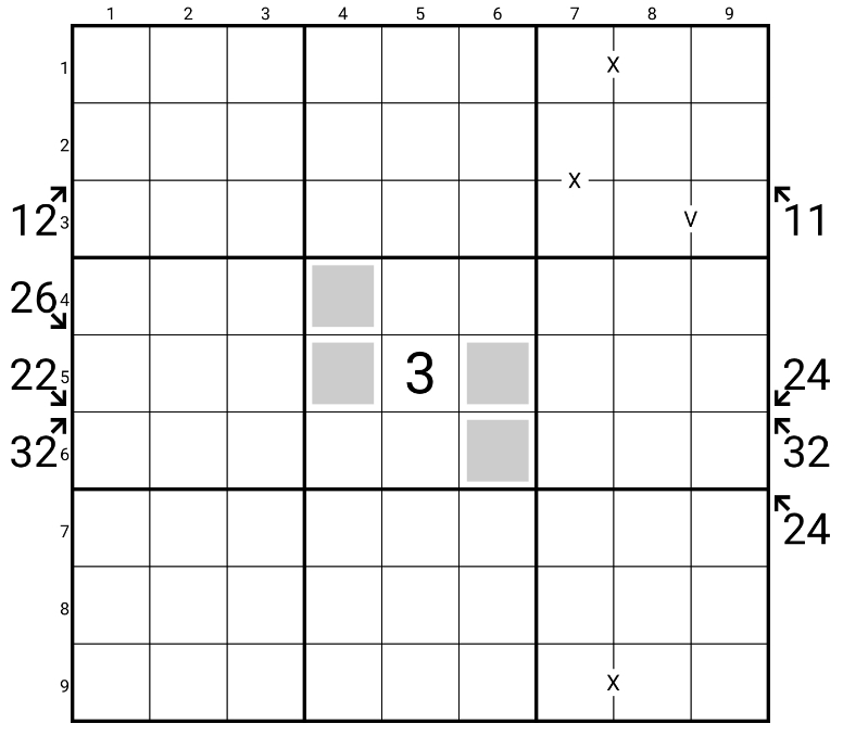 Cells with grey squares must contain even numbers. Cells joined by an X sum to 10 and those joined by V sum to 5. Digits along marked diagonals sum to the number indicated outside the grid.