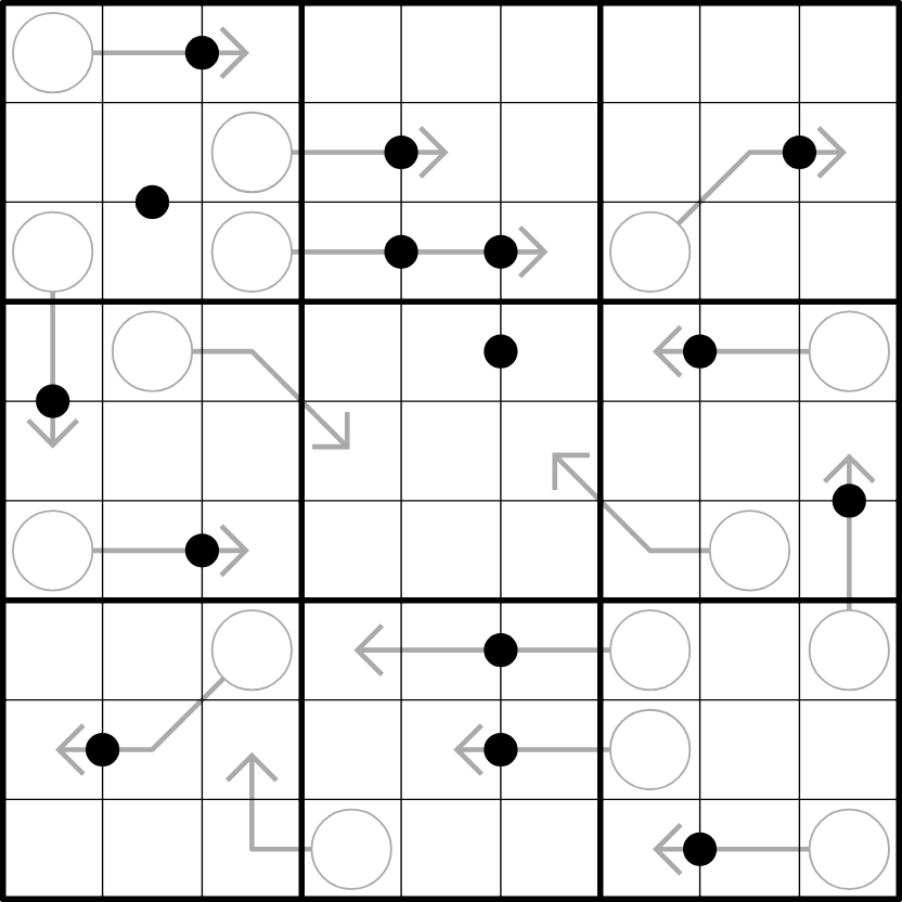 Cells joined by a black dot have a ratio of 1:2 (one digit is double the other). Not all dots are given.