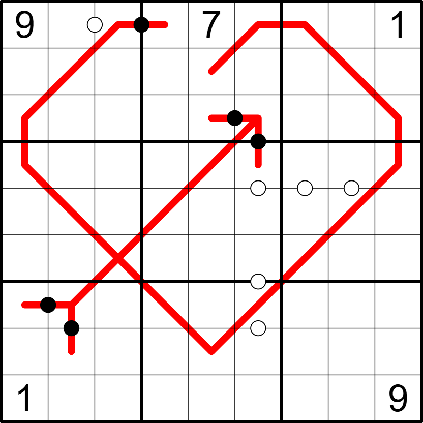 Ratio Line: For every pair of adjacent digits on the red line, one must be a factor/multiple of the other. Digits allowed on the line need to be from the set (2, 3, 4, 6, 8, 9).