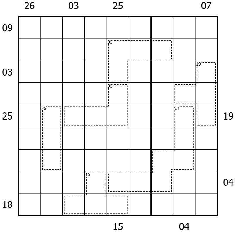- Ambiguous clues: A number outside the grid is either a valid Up to N clue or a valid Look and Say clue, but never both. A cage is either a valid Killer cage, or a valid Look and Say cage, but never both.