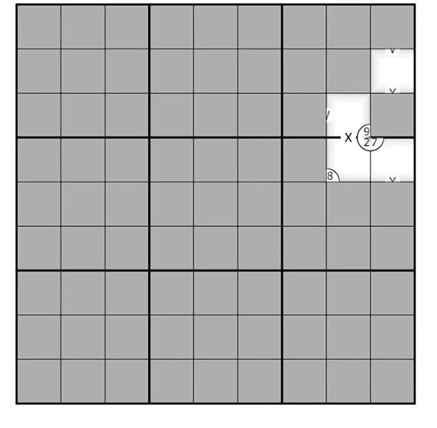 Rules say...."all possible x's and v's are shown" That means you cant for example have a 6 next to a 4 unless there is an X between them. This is called a negative constraint.