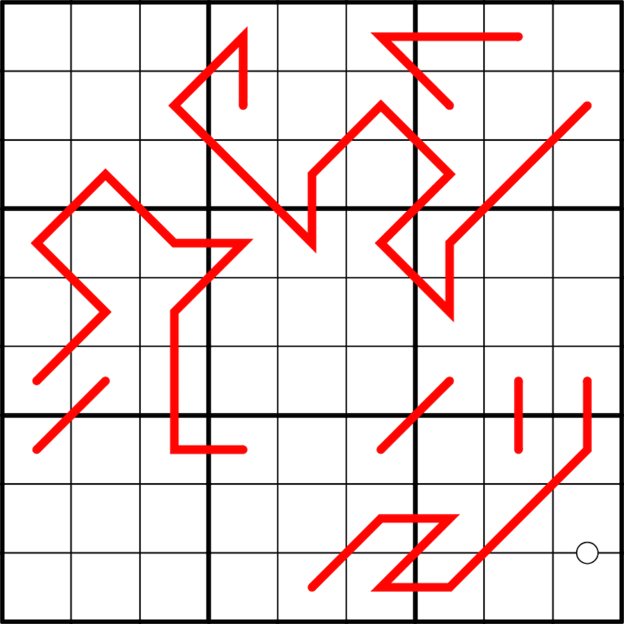 The red lines are Complementary Region Sum Lines where each line adds up to one of two sums within each box it passes through. These two sums are complements of ten and alternate every time the line enters or re-enters a new box (eg. /34/12/7/3/16/ etc). Different red lines may have different pairs of sums.