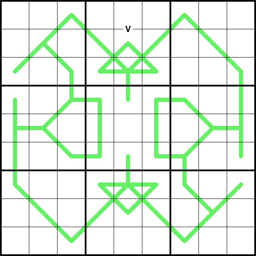 V: Digits in cells joined by a V sum to 5. Not all Vs are given.