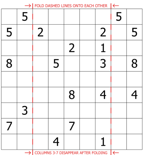 • If the cells between the dashed columns are removed, all regions and clues fold into valid regions and clues in the resulting 4x9 grid.