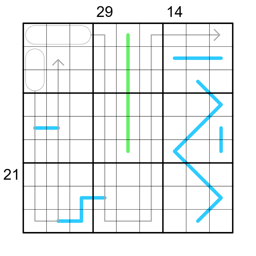 Equal-sum line: Each blue line in the grid has the same sum of digits (not to be confused with region sum lines).