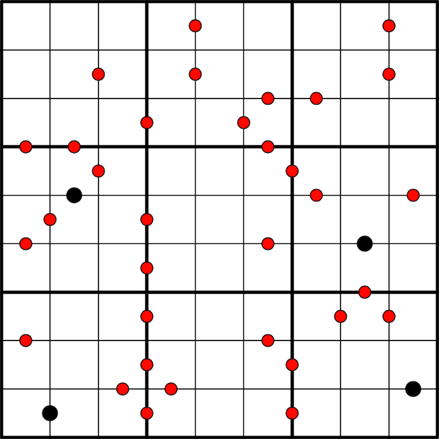 Digits separated by a red dot have a difference of four. All red dots are given and no red dots are hiding under black dots.