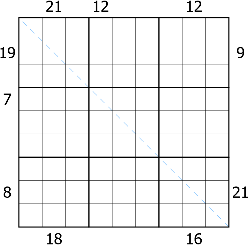 Periodic Sums: A clue outside the grid indicates the sum of the first cell seen in its row or column and every Nth cell after, where N is the digit in the first cell. (For example, if r2c1 is a 3, then the digits in r2c1, r2c4, and r2c7 must sum to 19.)
