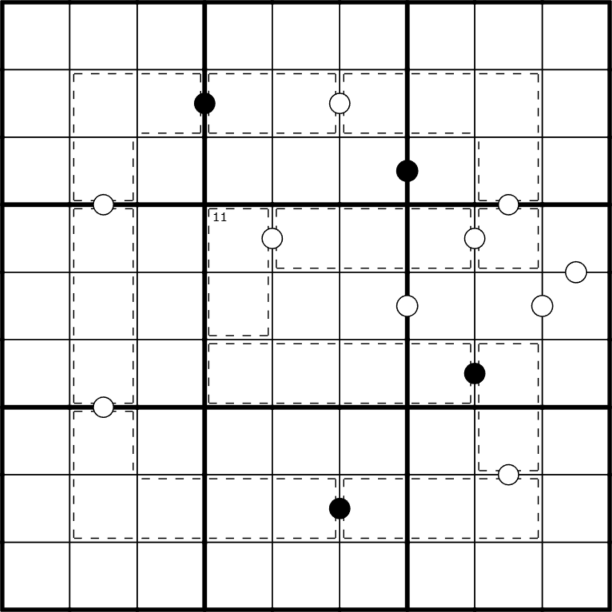 Kropki: weiße Punkte stehen zwischen Zahlen, die aufeinanderfolgend sein müssen. schwarze Punkte stehen zwischen Zahlen, die in einem Verhältnis von 1:2 stehen. Es sind nicht alle Punkte gegeben. Punkte zwischen zwei Käfigen beziehen sich auf die Käfigsummen anstelle der einzelnen Zellen.