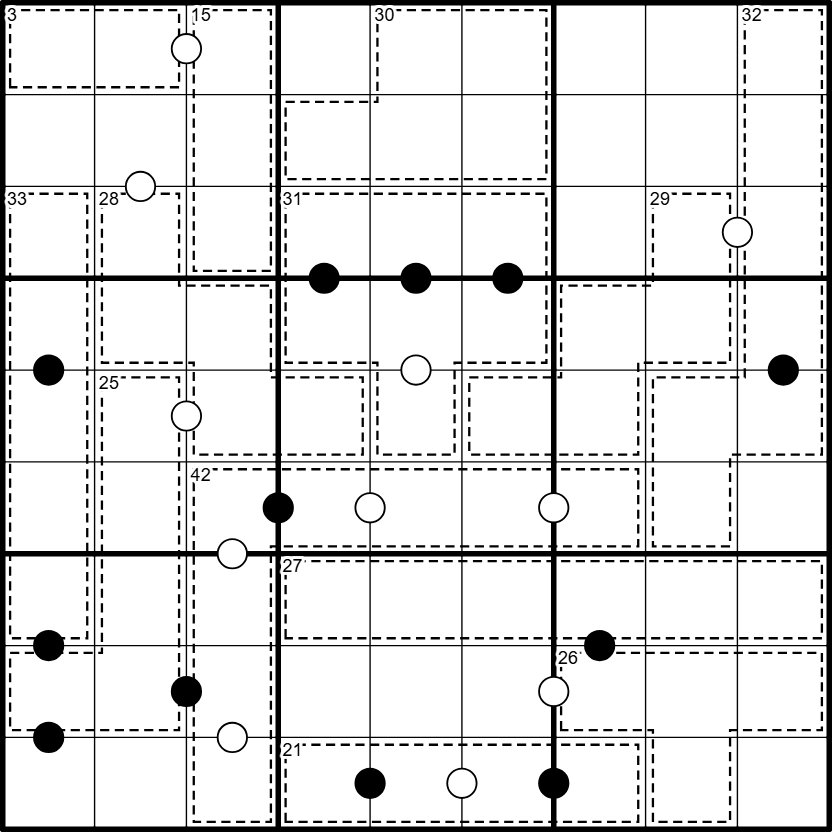 Kropki Dots are running wild inside the Killer Cages. I hope you enjoy solving this puzzle. All comments and feedback are appreciated. Thank you.