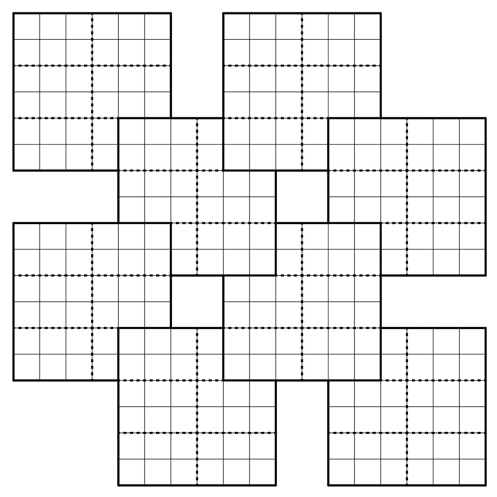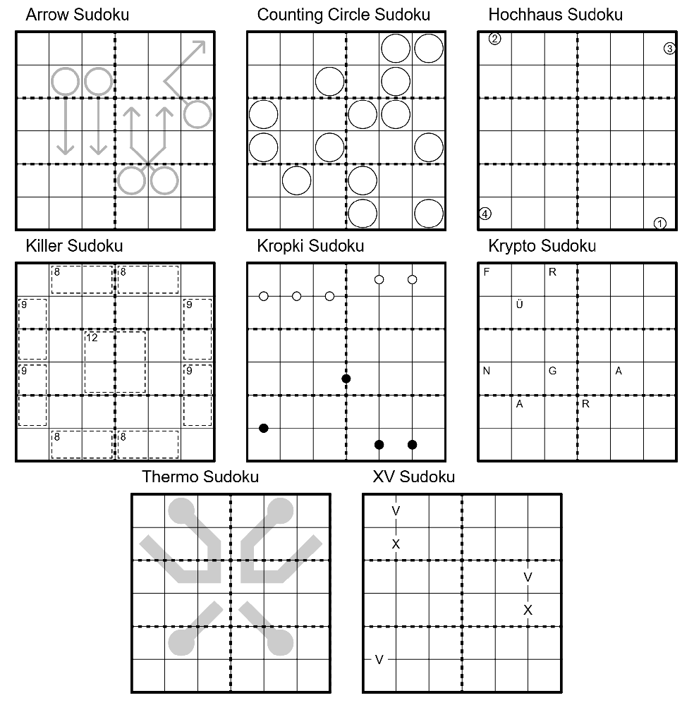 Der Weihnachtsmann hat dieses Jahr sein komplettes Wichtelteam beauftragt, ein Sudoku für Grana zu erstellen. Ganz zu seinem Unmut haben die zerstrittenen Wichtel den Auftrag falsch verstanden, und jeder Einzelne hat ein separates 6x6-Sudoku erstellt: Ein Arrow Sudoku, ein Counting Circle Sudoku (enthält ein Kreis eine Ziffer N, so enthalten genau N Kreise diese Ziffer), ein Hochhaus Sudoku, ein Killer Sudoku, ein Kropki Sudoku (ohne Negativbedingung), ein Krypto Sudoku (gleiche Buchstaben stehen für gleiche Ziffern, unterschiedliche Buchstaben für unterschiedliche Ziffern), ein Thermo Sudoku, und ein XV Sudoku (ohne Negativbedingung). Und noch viel schlimmer - keines der acht Sudokus war eindeutig lösbar, manche waren sogar unlösbar. Kurzerhand griff sich der Weihnachtsmann die acht Rätsel und fertigte eine Collage an, bei der sich zwei Rätsel jeweils in einem 2x2-Bereich an den Ecken überlappen. Ziffern, die sich auf den Überlappungen befinden, zählen nun für beide Rätsel. Die Überlappungen beeinflussen auch die Hinweise - für jedes Rätsel zählen nur noch die Hinweise und Teile von Hinweisen, die immer noch sichtbar sind. Unter den Überlappungen kann alles anders sein, als im ursprünglichen Rätsel: Zum Beispiel können Killer-Käfige, die teilweise von einer Überlappung überdeckt werden, unter der Überlappung andere Felder beinhalten, solange die noch sichtbare Umrandung des Käfigs weiterhin Sinn ergibt. Ähnlich dazu dürfen Arrows oder Thermos, die teilweise überdeckt werden, unter der Überdeckung beliebig verlaufen, solange der sichtbare Teil (inklusive des Übergangs unter die Überlappung) valide ist. Wenn die Summe eines Killer-Käfigs überdeckt ist, kann der Käfig eine beliebige Summe haben. Kropki-Kreise, die sich komplett unter einer Überlappung befinden, können ignoriert werden, aber solche, die nur zur Hälfte verdeckt werden, sind weiterhin gültig. Counting Circles können unter einer Überlappung beliebig entfernt oder hinzugefügt werden.