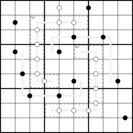 DASHED REGIONS- Numbers in dashed regions sum to the number in the top left corner of the region. Numbers may repeat in regions, if other rules allow.