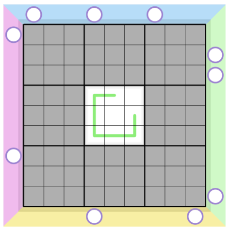 ENTROPIC LINES: Any 3 adjacent digits along a hollow peach line must contain one digit from {1, 2, 3}, one digit from {4, 5, 6} and one digit from {7, 8, 9}.