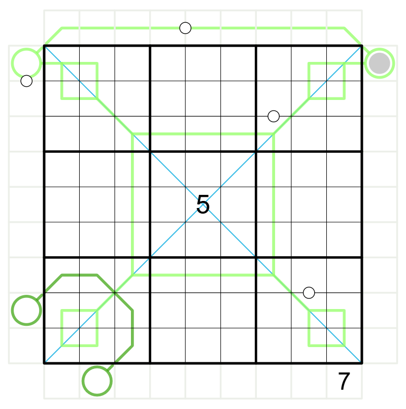 - The sum of values in cells connecting two green circles is equal to a concatenation of the values in the circles, in some order. For instance, 3-346-1 could be a valid line, as 3+4+6=13=1 concatenated with 3. Circles containing double digits numbers are treated as one value, so two circles containing 10 and 23 could be concatenated to form 1023 or 2310.