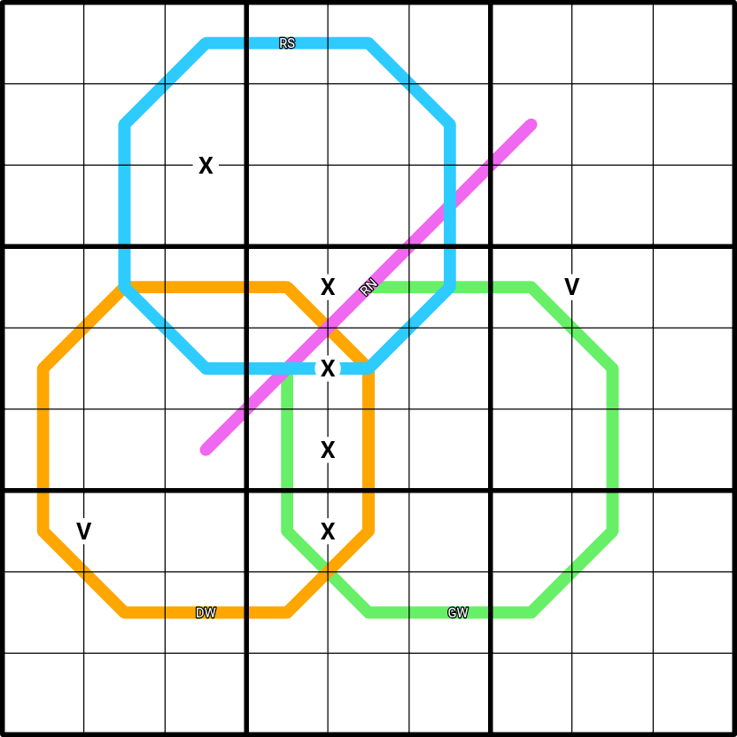 Cells connected by a pink Renban [RN] line form a set of consecutive digits, in any order, without repeats.