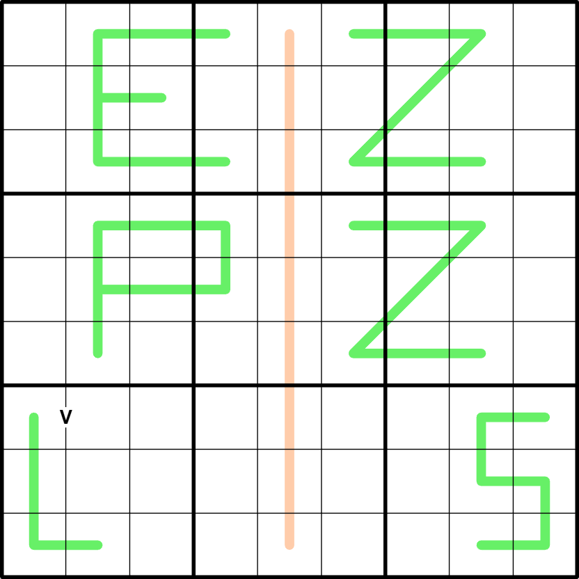 Entropic: Any sequence of 3 adjacent digits along a peach line must have a low digit (123), a medium digit (456) and a high digit (789).