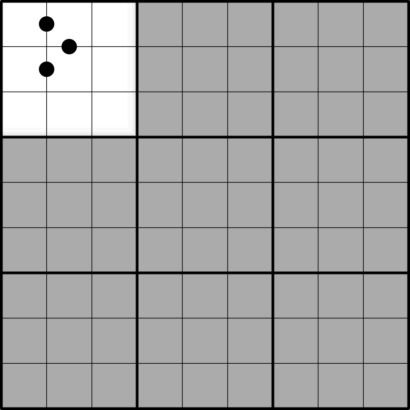 - Bei allen Ziffern muss mindestens eine der acht umgebenden Zellen aufeinanderfolgend sein; die Werte werden auch wieder aufgefüllt, was bedeutet, dass für diese Bedingung 1 und 9 aufeinanderfolgend sind.