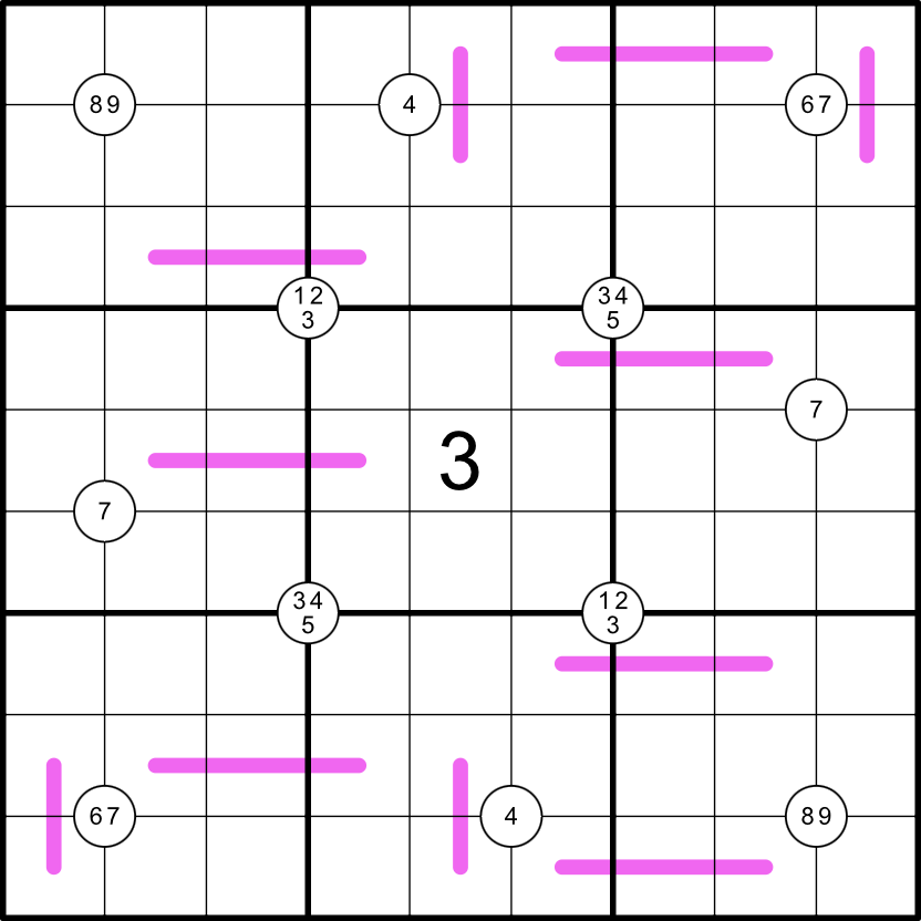 - Digits in a Quadruple circle must appear in the surrounding four cells.