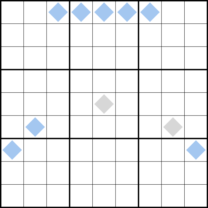Grey diamonds (clones): Both cells with a grey diamond contain the same digit.