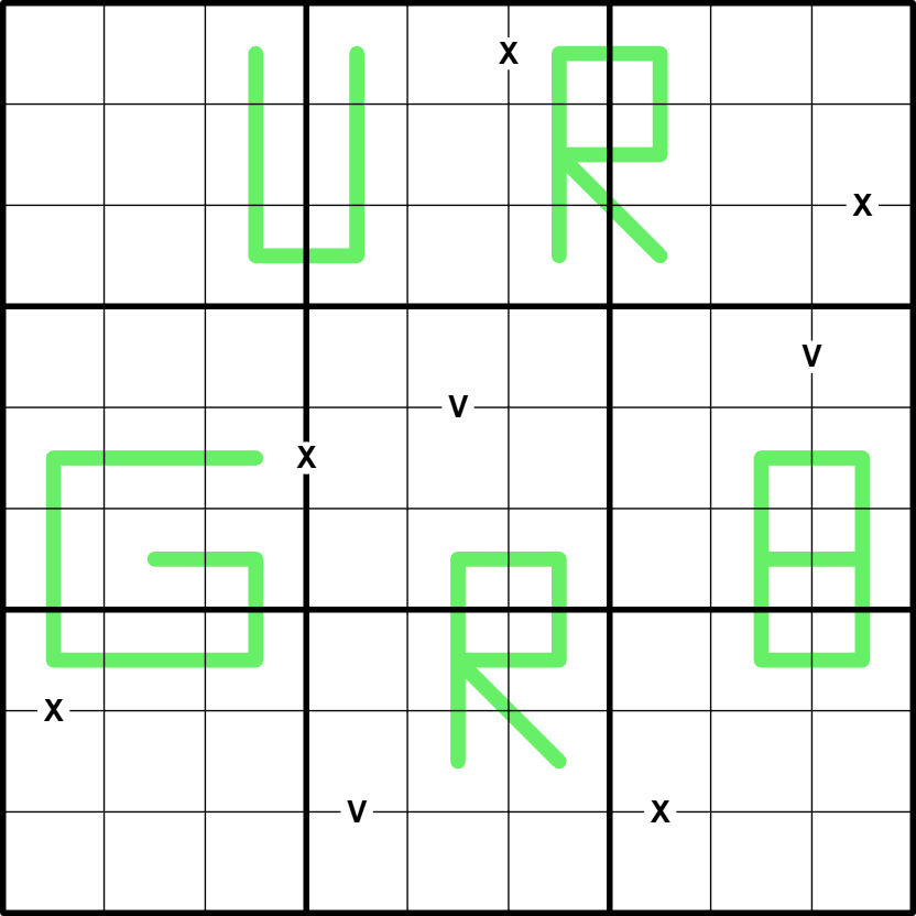 X/V: Digits in cells joined by an X sum to 10. Digits in cells joined by a V sum to 5. Not all Xs and Vs are given.