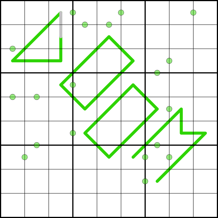 Orthogonally adjacent cells can not sum to 5 or 10 without a green dot connecting them.