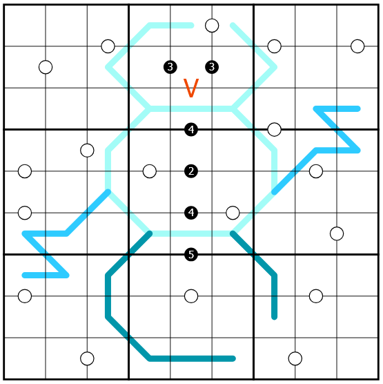 Region sum line: For each line, digits on the line have an equal sum N within each box it passes through.