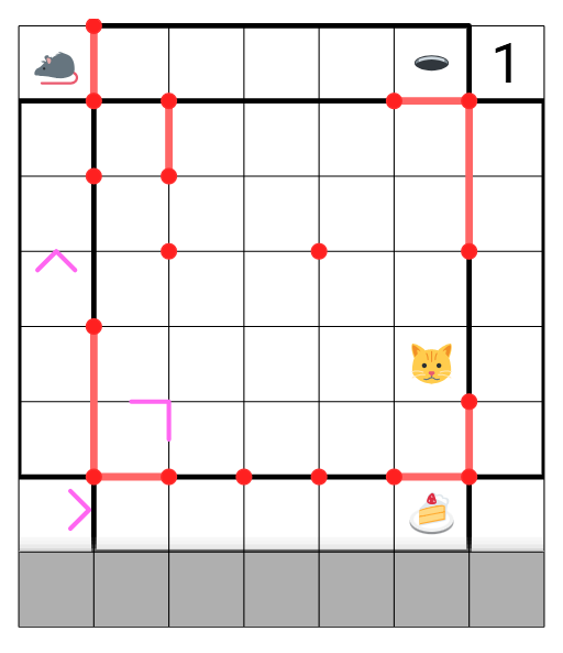- One-way Doors: The rat and the cat may only pass through pink arrows if moving in the direction the arrow is pointing. An arrow always points to the smaller of the two values it sits between.