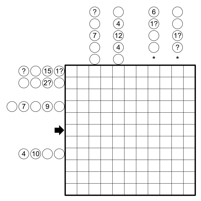 - In this puzzle, a question mark (?) can represent any single digit from 0-9, but a single digit clue cannot be zero (0). An asterisk (*) shows an arbitrary number of circle clues, which can be none at all.