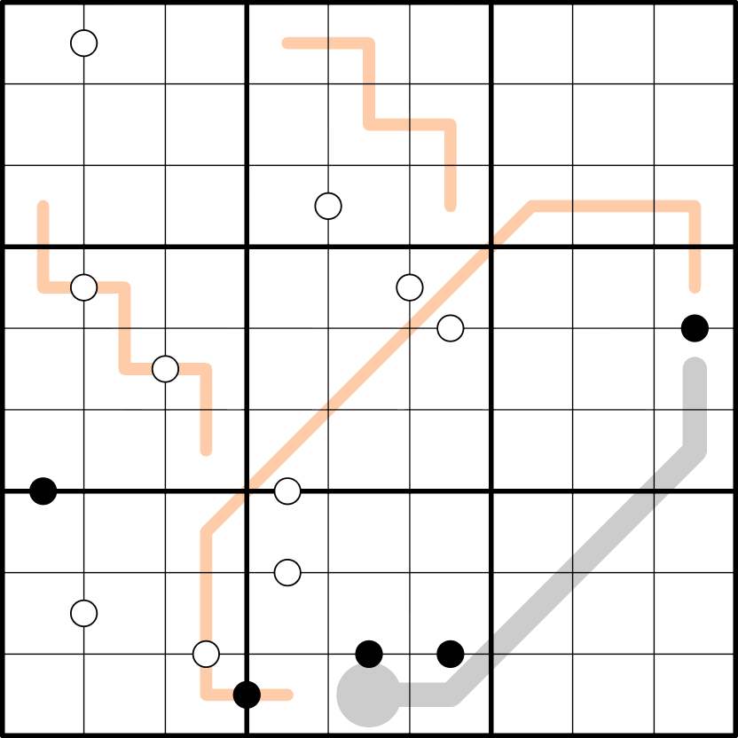 Every 3 consecutive digits on a peach line alternate between low (123), middle (456), high (789) digits.