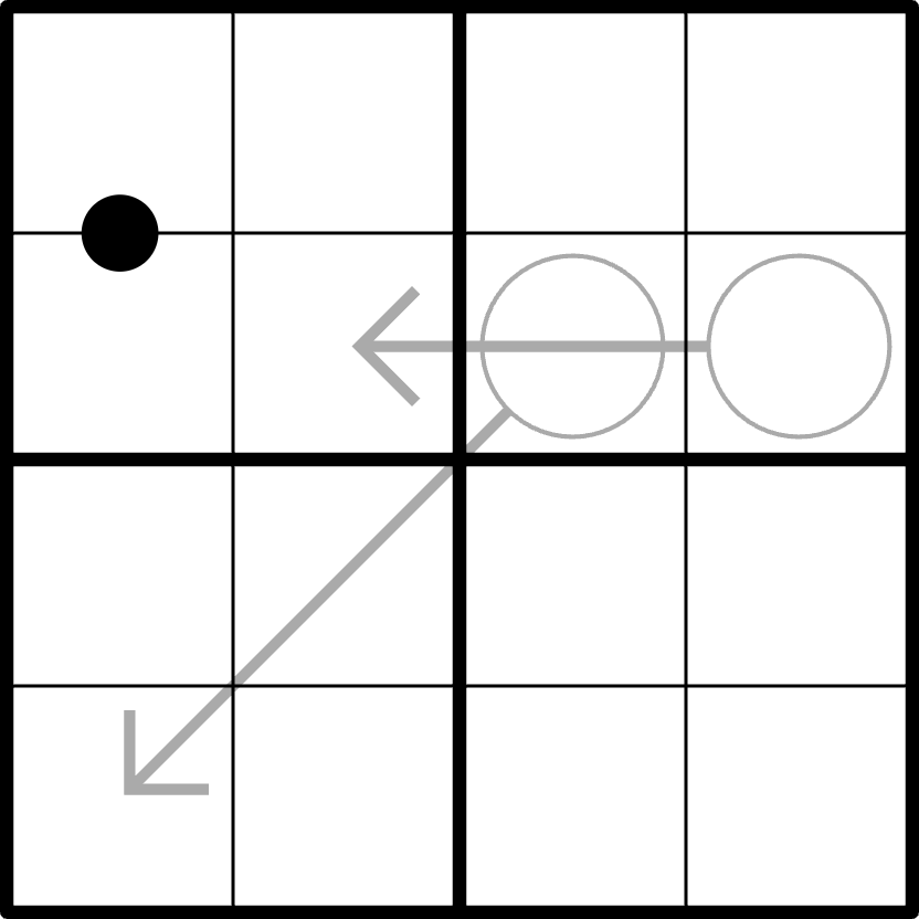 - Der schwarze Punkt verbindet zwei Zahlen, von denen eine doppelt so groß wie die andere ist.