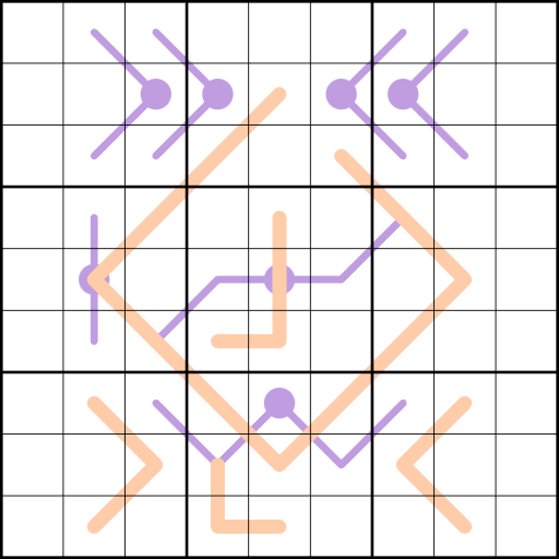 Entropic Lines: Each set of three consecutive digits along a thick peach line will contain one low digit (1,2,3), one medium digit (4,5,6) and one high digit (7,8,9).