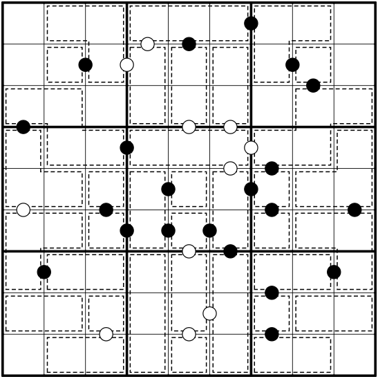 Ein weißer Punkt zwischen zwei gestrichelt umrandeten Gebieten zeigt an, dass die Summen innerhalb dieser Gebiete die Differenz eins haben. Ein schwarzer Punkt zwischen zwei solchen Gebieten zeigt an, dass eine der beiden Summen das Doppelte der anderen Summe ist. Wenn zwischen zwei Gebieten kein Punkt ist, können diese Gebiete keine Summen haben die die Differenz eins haben oder bei der die eine das Doppelte der anderen ist. Innerhalb dieser Gebiete dürfen sich Ziffern nicht wiederholen.
