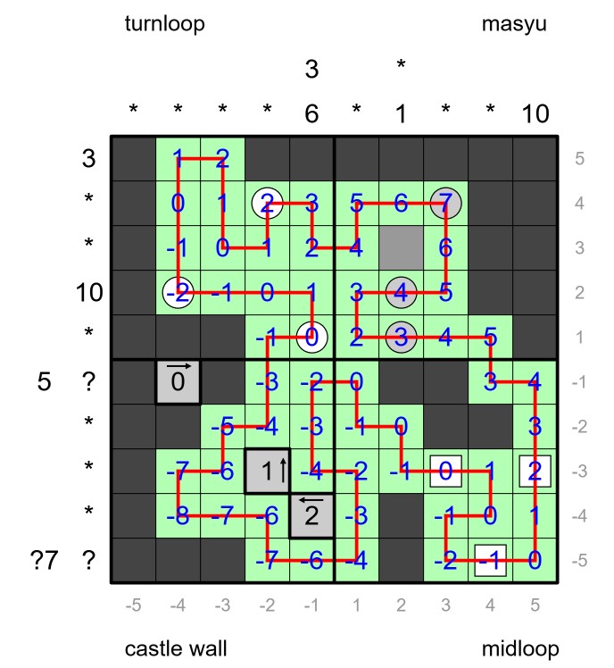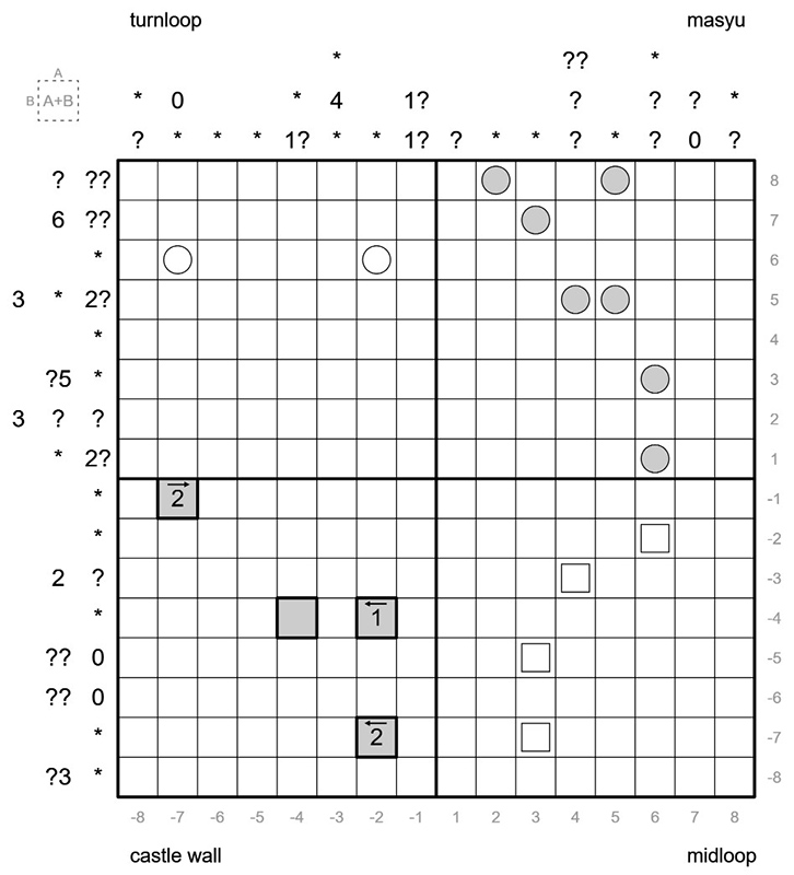Furthermore, the grid is divided in four quadrants. In each quadrant, there is a single and distinct clue type that appears only within the boundaries of that quadrant and interacts only with the cells of its quadrant and inside the borders of its quadrant. The clue types and relative rules are as follows: