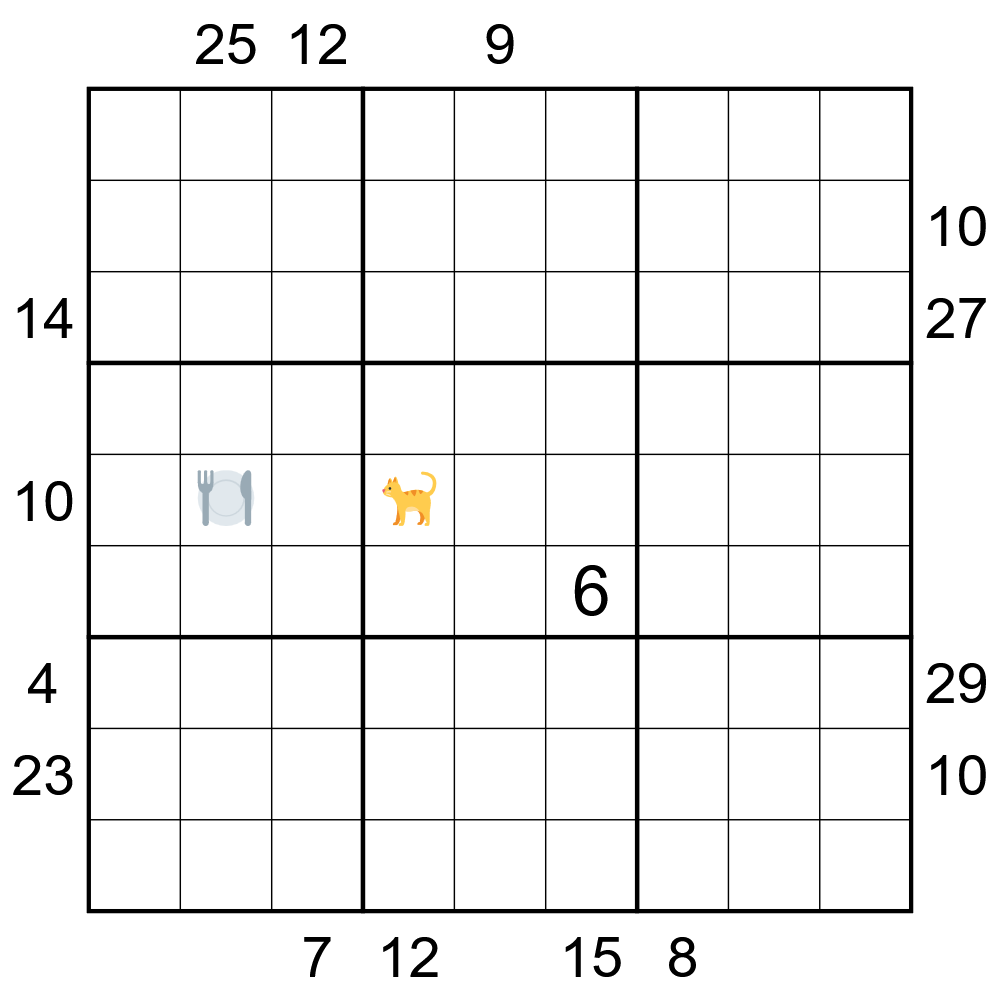 - A clue outside the grid is the sum of the values of the first X cells in the corresponding row/column, where X is the value of the cell nearest to the clue.