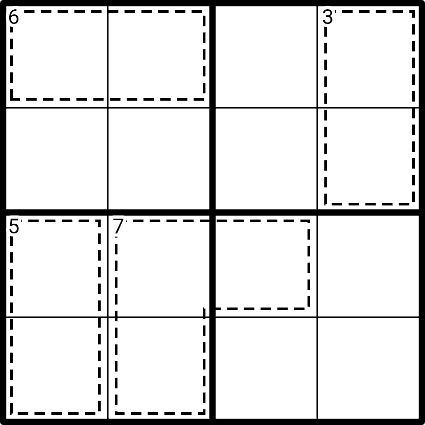 - Die gestrichelten Objekte nennt man Killer Käfige (keine Sorge, die bringen niemanden um und sind auch nicht mörderisch schwer). Die Ziffern in diesen Käfigen müssen sich zur angegebenen Zahl in der oberen, linken Ecke addieren. Ziffern wiederholen sich NICHT in Killer Käfigen.