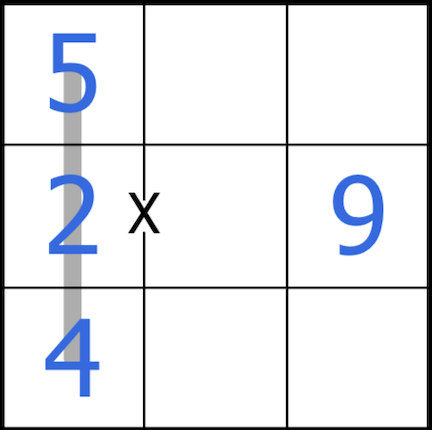 3. Digits across an x symbol add to ten. (i.e. 3x7 or 4x6)