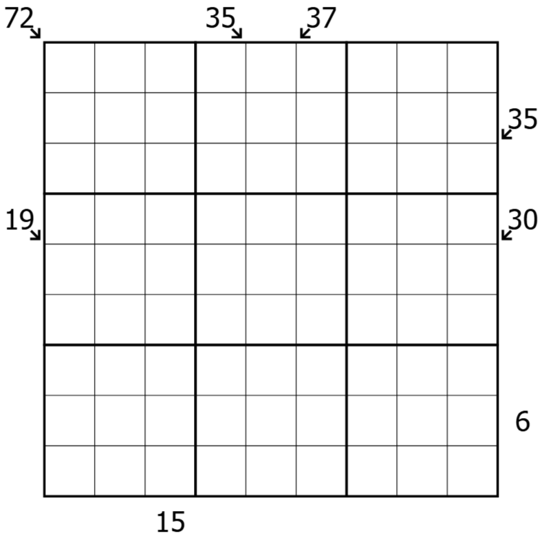 Sandwich clues: Digits outside the box without an arrow equal the sum of digits located between 1 and 9 on the respective column or row.