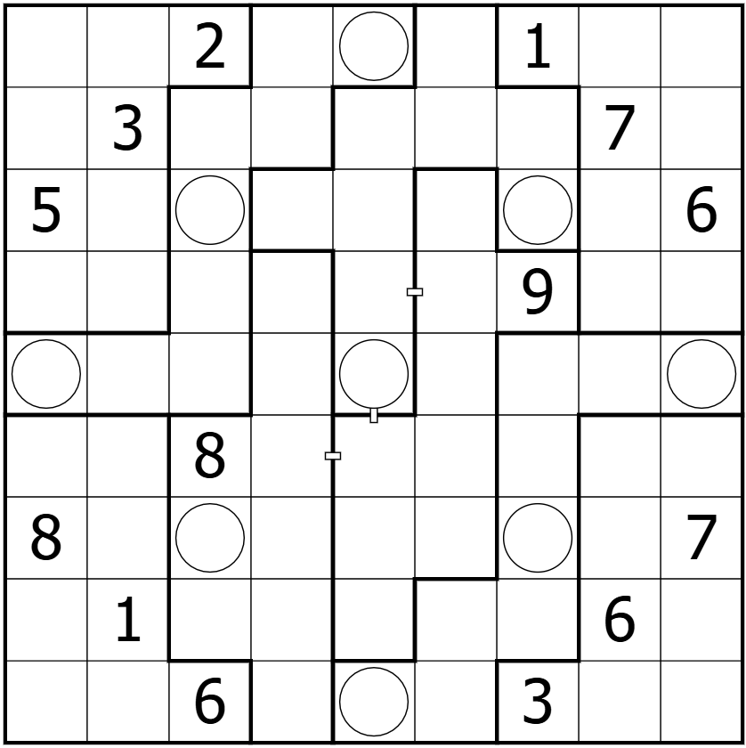 - Parasites: Draw parasites moving orthogonally through the grid that connect all circles that share the same digit. Parasites may not move diagonally, branch, or cross themselves nor each other, but they may touch themselves and each other otherwise. The start and end of each parasite must occur on distinct circles. Small white rectangles indicate cell borders crossed by a parasite or different parasites.