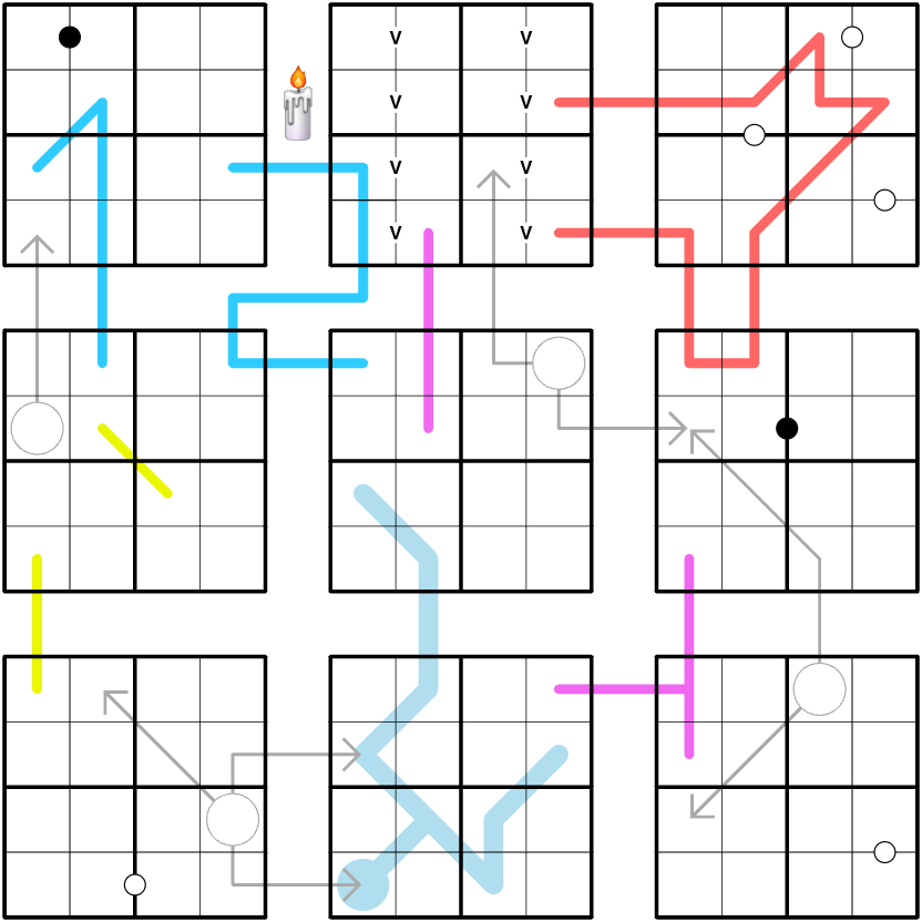 • Die Zellen zwischen den Sudokus bleiben leer und haben keinen Einfluss auf die Linien! (Z.B. müssen benachbarte Ziffern auf einer Paritäts Linie unterschiedliche Parität (gerade, ungerade) haben, auch wenn leere Zellen dazwischen sind.)