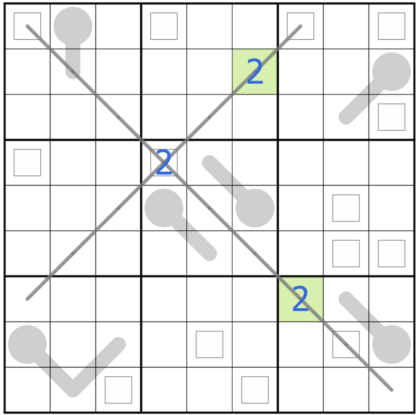 Digits in boxes look diagonally. Calling the digit in the box N, there are exactly N amounts of the same digit in its diagonals. (For example: if we put a 2 in the box, then it will see exactly two other 2s in its diagonals.)