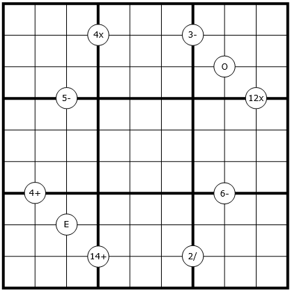 Einige Schnittpunkte der Rasterlinien sind mit Kreisen versehen, in denen eine Zahl und ein Operator (+, -, X, /) angegeben sind. Die Zahl ist das Ergebnis der Operation, wenn man den Operator auf die beiden sich diagonal gegenüberliegenden Zahlenpaare anwendet. Bei einem "E" im Kreis müssen alle vier angrenzenden Zahlen gerade sein; bei einem "O" ungerade.
