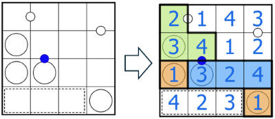 Erstelle Bereiche aus orthogonal verbundenen Zellen. Jeder Bereich enthält genau einen Kreis. Die Zahl im Kreis gibt die Größe des Bereichs an. Innerhalb eines Bereichs darf keine Ziffer doppelt vorkommen, und die Summe aller Ziffern innerhalb eines Bereichs muss eine Quadratzahl sein (1, 4, 9, 16 usw.). Nicht alle Zellen müssen zu einem Bereich gehören.