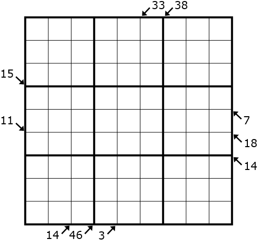 Hinweise außerhalb des Gitters geben die Summe der Ziffern eines Palindroms an, das sich irgendwo in der diagonalen Richtung befindet, die der Pfeil anzeigt, und das aus mindestens drei Ziffern besteht.