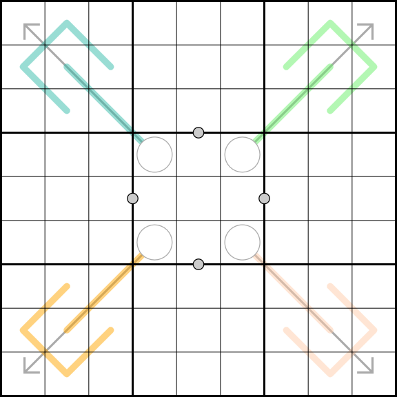 • A set of three sequential cells along a peach line must contain a low [123], middle [456], and high [789] digit.