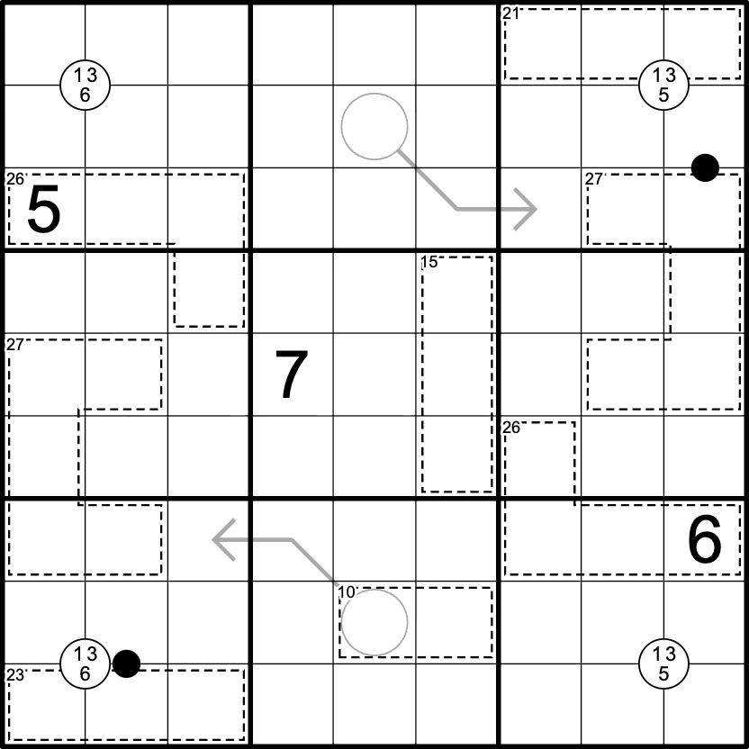 You explain white kropki's in the rules, but none of em in the puzzle. You do not explain arrows, but they do appear in the puzzle.