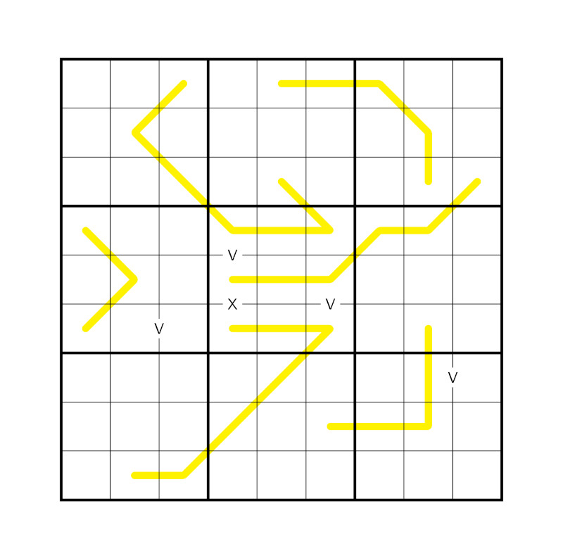 Der Buchstabe V zwischen zwei Feldern bedeutet, dass ihre Ziffern Summe 5 haben. Für den Buchstaben X ist die Summe entsprechend 10. Nicht alle solche Buchstaben sind notwendigerweise angegeben.