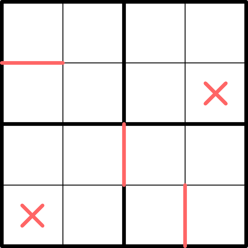 - Yin-Yang: Färbe manche Zellen, sodass alle gefärbten und alle ungefärbten Zellen orthogonal verbunden sind und kein 2×2 Quadrat komplett gefärbt oder komplett ungefärbt ist.